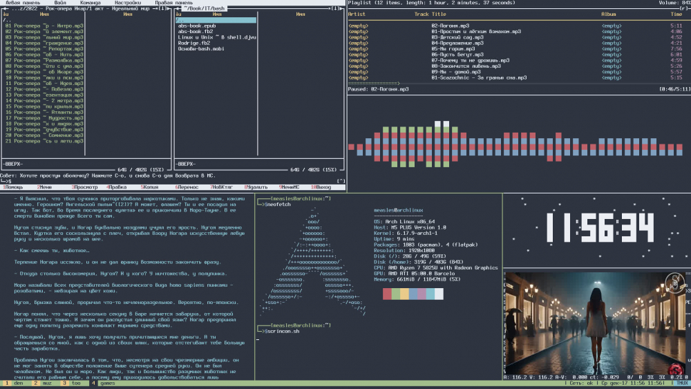 На скрине — виртуальная консоль без иксов, tmux, книга, музыка, клип.