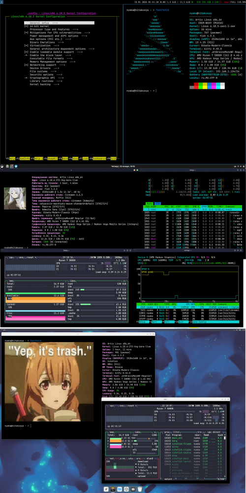 Кулеры вполне бодро работают (хоть и не всегда), а в Корице нередко заметны фризы. Добрые люди предположили, что это из-за плохой оптимизаций иксов, и в частности muffin, под большие разрешения и встроенные видеокарты, поэтому решила поэкспериментировать с BSPWM и MangoWC, может ещё чего поставлю.