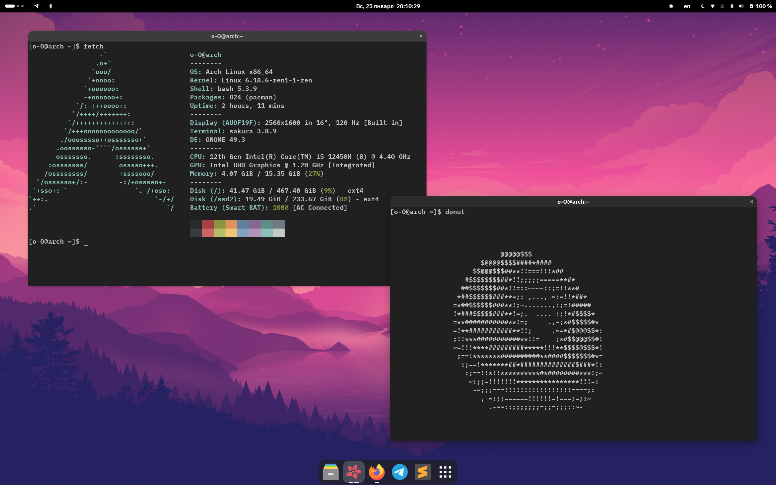 С того момента им я и пользуюсь. В конце концов выбрал GNOME, для лэптопа очень даже, но задумываюсь о смене графического окружения. Хочется оконников, но пока не дорос, хотя уже написал свой конфиг на i3 (очень простенький, но это первый опыт). Также система пережила пару переустановок, виной которых моя неопытность. Сейчас же все стабильно и почти ничего не ломается. Переезжать с арча я не планирую, но уже попробовал Void и положил глаз на Gentoo. Если и случится обновка, то скорее всего на нее. Но это в будущем.