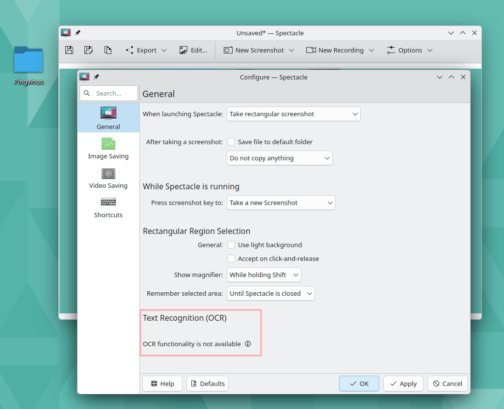 Утилита для создания скриншотов Spectacle теперь поддерживает распознавание текста на изображениях. Чтобы функция OCR была активна, в системе должены быть установлены пакеты tesseract.