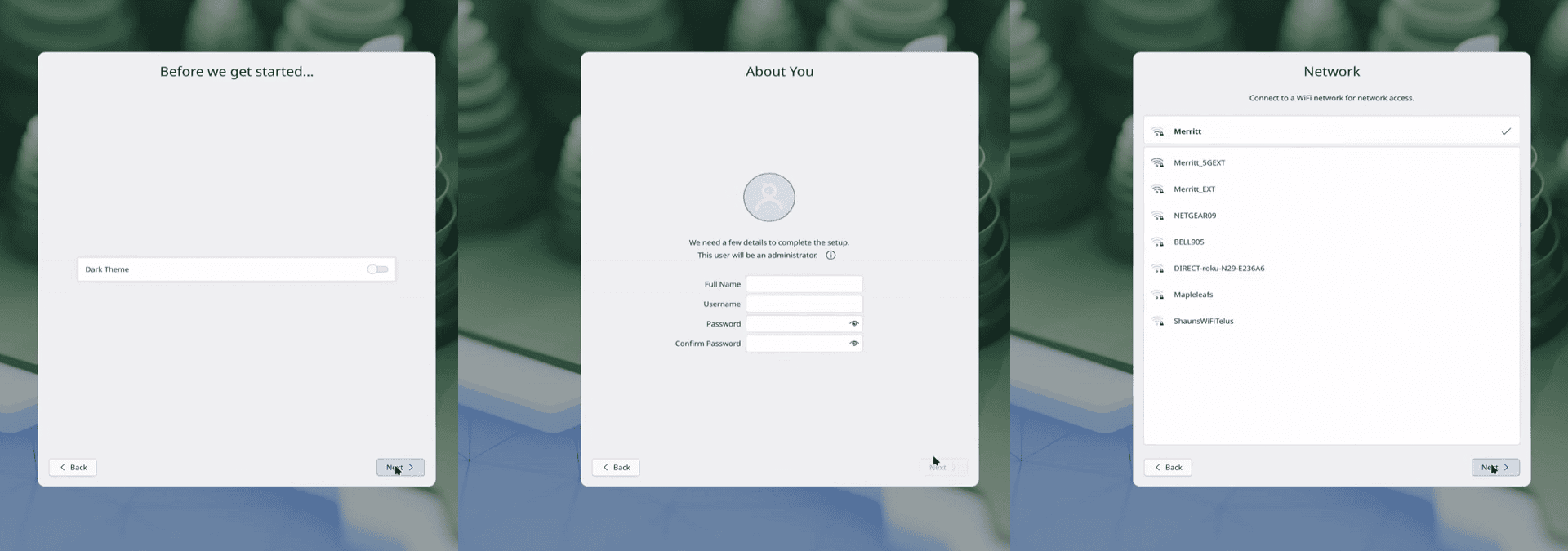 Разработан новый мастер начальной настройки Plasma Setup, который предназначен для начальной настройки системы при первом запуске после установки. Через Plasma Setup можно создать учетную запись пользователя, подключиться к сети, выбрать язык, часовой пояс, тему оформления и раскладку клавиатуры. Подобный мастер может быть использован на устройствах, которые поставляются с предустановленной KDE Plasma.