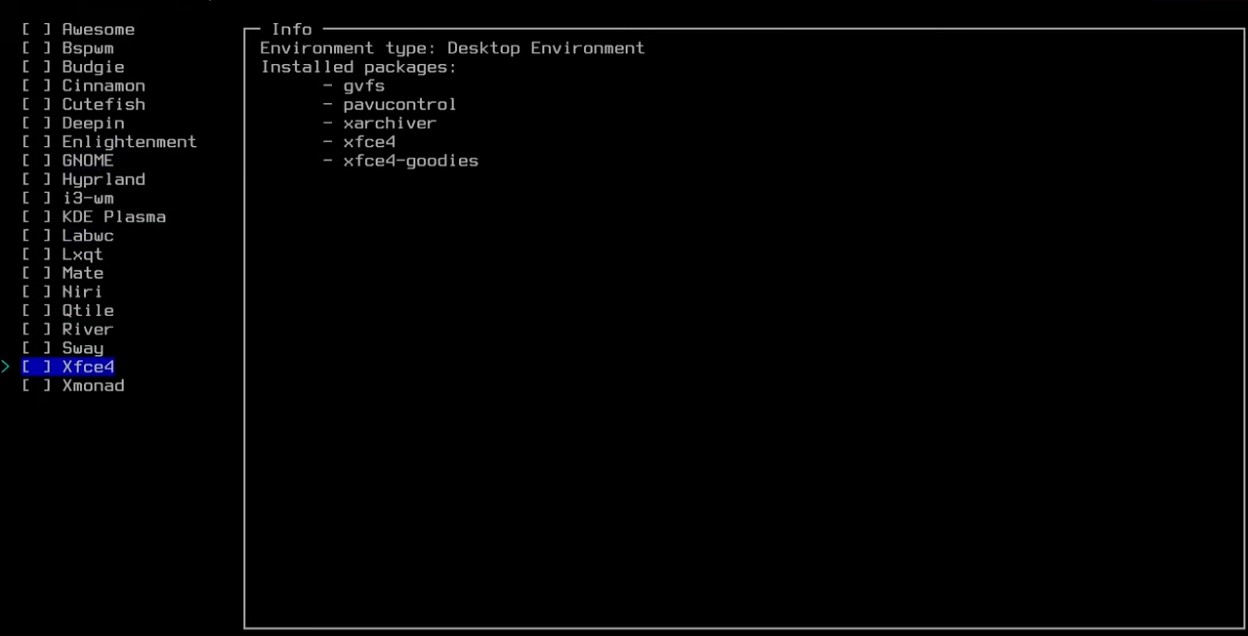 Итого, если согласны на systemd-boot или знаете, как установить grub, то лучше смотрится archinstall с более широким выбором DE. Если же хотели Arch с grub и не разобрались, то после перезагрузки вас ждёт разочарование, а в mini.iso grub по умолчанию и встаёт без приSidаний.