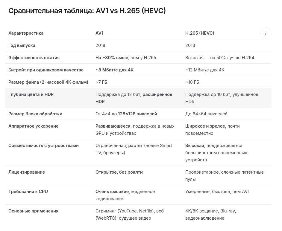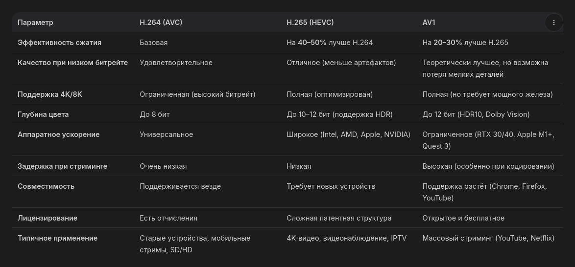 AV1 плохо подходит для устройств со средними характеристиками, особенно в реальном времени (VR-трансляции, видеонаблюдение, мобильные стримы). H.265, несмотря на более высокие требования по сравнению с H.264, остаётся лучшим компромиссом между эффективностью и нагрузкой.
