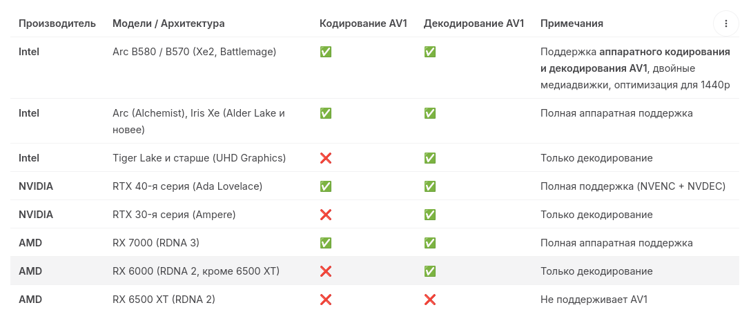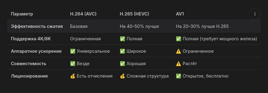 - AV1: Требует новых чипов (например, NVIDIA RTX 30/40, Apple M1+, Intel 11-го поколения и новее). Даже при аппаратной поддержке кодирование AV1 остаётся медленным.