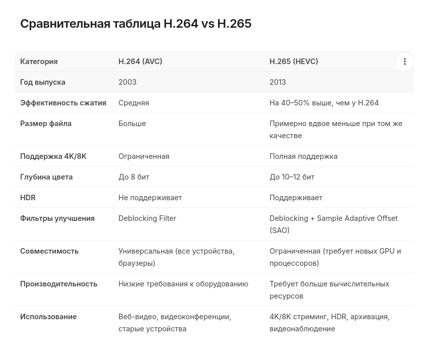 Ниже представлено сравнение ключевых аспектов H.264, H.265 и AV1, чтобы прояснить, почему H.265 может быть более предпочтительным выбором в ряде сценариев.